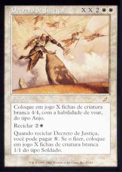 | Nome em Inglês: | Decree of Justice | | Nome em Português: | Decreto de Justiça | | Custo de Mana: |      | | Tipo: | Feitiço | | Texto: | Coloque no Campo de Batalha X fichas de criatura branca 4/4 do tipo Anjo com Voar. Reciclar  . Quando você Reciclar Decree of Justice, você pode pagar . Se o fizer, coloque no Campo de Batalha X fichas de criatura branca 1/1 do tipo Soldado. | | Série: |  | | Raridade: | Raro | | Card: | 008 |