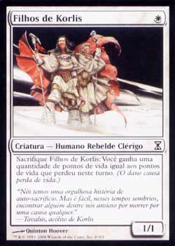 | Nome em Inglês: | Children of Korlis | | Nome em Português: | Filhos de Korlis | | Custo de Mana: |  | | Tipo: | Creatura - Humano Rebelde Clérigo | | Texto: | Sacrifice Children of Korlis: Você ganha uma quantidade de pontos de vida igual aos pontos de vida que você tiver perdido durante este turno. | | P/T: | 1/1 | | Série: |  | | Raridade: | Comum | | Card: | 008 |