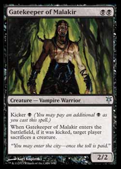 | Nome em Inglês: | Gatekeeper of Malakir | | Nome em Português: | Sem nome em Português | | Custo de Mana: |   | | Tipo: | Criatura - Vampiro Guerreiro | | Texto: | Reforçar . Quando Gatekeeper of Malakir entrar no Campo de Batalha, se ele foi Reforçado, o jogador alvo sacrifica uma criatura. | | P/T: | 2/2 | | Série: |  | | Outras: | | | Raridade: | Incomum | | Card: | 008 |