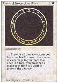 | Nome em Inglês: | Circle of Protection: Black | | Nome em Português: | Sem nome em Português | | Custo de Mana: |   | | Tipo: | Encantamento | | Texto: | : Na próxima vez que uma fonte preta de sua escolha fosse causar dano a você durante este turno, previne aquele dano. Nota: Este card não foi lançado em Alpha, primeiro set de Magic. | | Série: |  | | Outras: | | | Raridade: | Comum | | Card: | 009 |