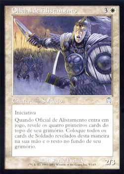 | Nome em Inglês: | Enlistment Officer | | Nome em Português: | Oficial de Alistamento | | Custo de Mana: |   | | Tipo: | Criatura - Humano Soldado | | Texto: | Iniciativa. Quando Enlistment Officer entrar no Campo de Batalha, revele os quatro cards do topo de seu grimório. Coloque todos os cards de Soldado revelados desta forma em sua mão e o restante no fundo de seu grimório em qualquer ordem. | | P/T: | 2/3 | | Série: |  | | Raridade: | Incomum | | Card: | 009 |