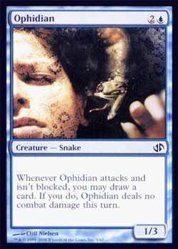 | Nome em Inglês: | Ophidian | | Nome em Português: | Sem nome em Português | | Custo de Mana: |   | | Tipo: | Criatura - Cobra | | Texto: | Toda vez que Ophidian atacar e não for bloqueado, você pode comprar um card. Se o fizer, Ophidian não causa dano de combate durante este turno. | | P/T: | 1/3 | | Série: |  | | Outras: | | | Raridade: | Comum | | Card: | 009 |