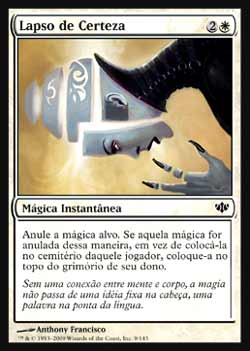 | Nome em Inglês: | Lapse of Certainty | | Nome em Português: | Lapso de Certeza | | Custo de Mana: |   | | Tipo: | Mágica Instantânea | | Texto: | Anula a mágica alvo. Se aquela mágica for anulada dessa maneira, coloque-a no topo do grimório de seu dono ao invés de colocá-la no cemitério daquele jogador. | | Série: |  | | Raridade: | Comum | | Card: | 009 |