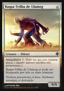 | Nome em Inglês: | Pathrazer of Ulamog | | Nome em Português: | Raspa-Trilha de Ulamog | | Custo de Mana: |  | | Tipo: | Criatura - Eldrazi | | Texto: | Aniquilador 3. Pathrazer of Ulamog não pode ser bloqueado exceto por três ou mais criaturas. | | P/T: | 9/9 | | Série: |  | | Raridade: | Incomum | | Card: | 009 |