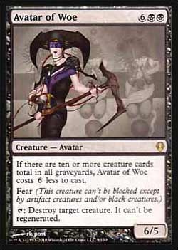 | Nome em Inglês: | Avatar of Woe | | Nome em Português: | Sem nome em Português | | Custo de Mana: |    | | Tipo: | Criatura - Avatar | | Texto: | Amedrontar. Se houver um total de dez ou mais cards de criatura em todos os cemitérios, Avatar of Woe custa a menos para ser Conjurado.