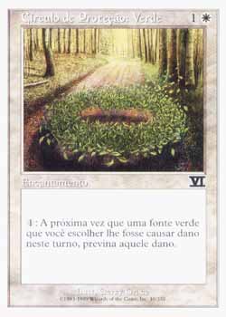 | Nome em Inglês: | Circle of Protection: Green | | Nome em Português: | Círculo de Proteção: Verde | | Custo de Mana: |   | | Tipo: | Encantamento | | Texto: | : Na próxima vez que uma fonte verde de sua escolha fosse causar dano a você durante este turno, previne aquele dano. | | Série: |  | | Outras: | | | Raridade: | Comum | | Card: | 010 |