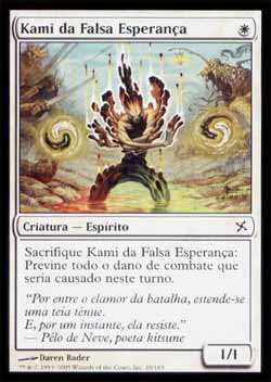 | Nome em Inglês: | Kami of False Hope | | Nome em Português: | Kami da Falsa Esperança | | Custo de Mana: |  | | Tipo: | Criatura - Espírito | | Texto: | Sacrifique Kami of False Hope: Previne todo o dano de combate que seria causado durante este turno. | | P/T: | 1/1 | | Série: |  | | Raridade: | Comum | | Card: | 010 |