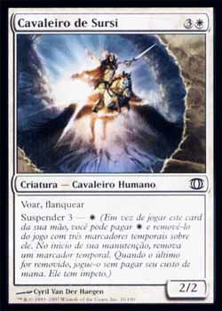 | Nome em Inglês: | Knight of Sursi | | Nome em Português: | Cavaleiro de Sursi | | Custo de Mana: |   | | Tipo: | Criatura - Humano Cavaleiro | | Texto: | Voar, Flanquear. Suspender 3 - . | | P/T: | 2/2 | | Série: |  | | Raridade: | Comum | | Card: | 010 |