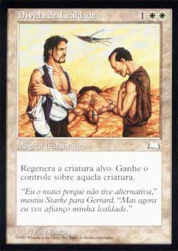 | Nome em Inglês: | Debt of Loyalty | | Nome em Português: | Dívida de Lealdade | | Custo de Mana: |    | | Tipo: | Mágica Instantânea | | Texto: | Regenera a criatura alvo. Você ganha controle daquela criatura se ela tiver sido Regenerada desta forma durante este turno. | | Série: |  | | Raridade: | Raro | | Card: | 011 |