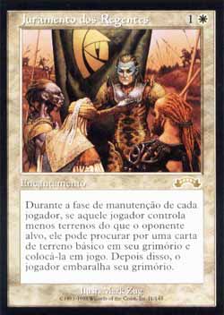 | Nome em Inglês: | Oath of Lieges | | Nome em Português: | Juramento de Regentes | | Custo de Mana: |   | | Tipo: | Encantamento | | Texto: | No início da Etapa de Manutenção de cada jogador, se aquele jogador controlar menos terrenos que qualquer um de seus próprios oponentes, aquele jogador pode procurar em seu próprio grimório por um card de terreno básico, colocar aquele card no Campo de Batalha, e então embaralhar seu próprio grimório. | | Série: |  | | Raridade: | Raro | | Card: | 011 |
