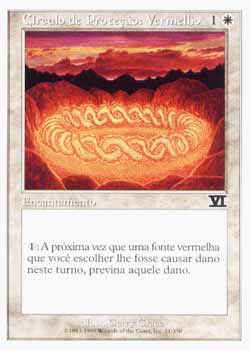 | Nome em Inglês: | Circle of Protection: Red | | Nome em Português: | Círculo de Proteção: Vermelho | | Custo de Mana: |   | | Tipo: | Encantamento | | Texto: | : Na próxima vez que uma fonte vermelha de sua escolha fosse causar dano a você durante este turno, previne aquele dano. | | Série: |  | | Outras: | | | Raridade: | Comum | | Card: | 011 |