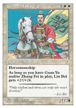 | Nome em Inglês: | Liu Bei, Lord of Shu | | Nome em Português: | Sem nome em Português | | Custo de Mana: |    | | Tipo: | Criatura Lendária - Humano Soldado | | Texto: | Cavalaria. Enquanto você tiver Guan Yu e/ou Zhang Fei no Campo de Batalha sob seu controle, Liu Bei, Lord of Shu ganha +2/+2. | | P/T: | 2/4 | | Série: |  | | Raridade: | Raro | | Card: | 011 |