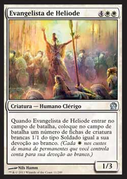 | Nome em Inglês: | Evangel of Heliod | | Nome em Português: | Evangelista de Heliode | | Custo de Mana: |    | | Tipo: | Criatura - Humano Clérigo | | Texto: | Quando Evangel of Heliod entrar no Campo de Batalha, coloque no Campo de Batalha um número de fichas de criatura branca 1/1 do tipo Soldado igual a sua Devoção ao branco. | | P/T: | 1/3 | | Série: |  | | Raridade: | Incomum | | Card: | 011 |
