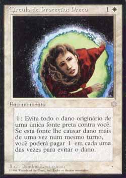 | Nome em Inglês: | Circle of Protection: Black | | Nome em Português: | Círculo de Proteção: Preto | | Custo de Mana: |   | | Tipo: | Encantamento | | Texto: | : Na próxima vez que uma fonte preta de sua escolha fosse causar dano a você durante este turno, previne aquele dano. Nota: Este card não foi lançado em Alpha, primeiro set de Magic. | | Série: |  | | Outras: | | | Raridade: | Comum | | Card: | 012 |
