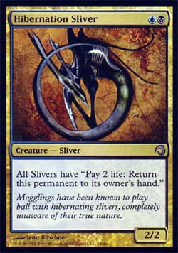 | Nome em Inglês: | Hibernation Sliver | | Nome em Português: | Sem nome em Português | | Custo de Mana: |   | | Tipo: | Criatura - Fractius | | Texto: | Todos os Fractius têm 'Pague 2 pontos de vida: Devolva esta Permanente para a mão de seu dono.' Errata: não confundir com Dormant Sliver, da série Caos Planar, que também foi traduzido para o português como Fractius Hibernante. | | P/T: | 2/2 | | Série: |  | | Outras: | | | Raridade: | Incomum | | Card: | 012 |