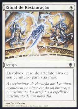 | Nome em Inglês: | Ritual of Restoration | | Nome em Português: | Ritual de Restauração | | Custo de Mana: |  | | Tipo: | Feitiço | | Texto: | Devolva o card de artefato alvo de seu cemitério para sua mão. | | Série: |  | | Raridade: | Comum | | Card: | 013 |