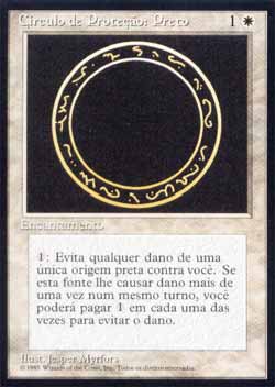 | Nome em Inglês: | Circle of Protection: Black | | Nome em Português: | Circulo de Proteção: Preto | | Custo de Mana: |   | | Tipo: | Encantamento | | Texto: | : Na próxima vez que uma fonte preta de sua escolha fosse causar dano a você durante este turno, previne aquele dano. Nota: Este card não foi lançado em Alpha, primeiro set de Magic. | | Série: |  | | Outras: | | | Raridade: | Comum | | Card: | 014 |