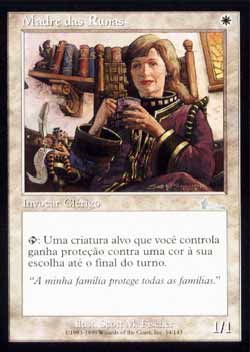 | Nome em Inglês: | Mother of Runes | | Nome em Português: | Madre das Runas | | Custo de Mana: |  | | Tipo: | Criatura - Humano Clérigo | | Texto: | : A criatura alvo que você controla tem Proteção contra a cor de sua escolha até o final do turno. | | P/T: | 1/1 | | Série: |  | | Outras: | | | Raridade: | Incomum | | Card: | 014 |
