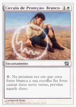 | Nome em Inglês: | Circle of Protection: White | | Nome em Português: | Círculo de Proteção: Branco | | Custo de Mana: |   | | Tipo: | Encantamento | | Texto: | : Na próxima vez que uma fonte branca de sua escolha fosse causar dano a você durante este turno, previne aquele dano. | | Série: |  | | Outras: | | | Raridade: | Incomum | | Card: | 014 |