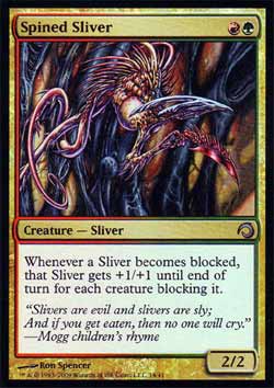 | Nome em Inglês: | Spined Sliver | | Nome em Português: | Sem nome em Português | | Custo de Mana: |   | | Tipo: | Criatura - Fractius | | Texto: | Toda vez que um Fractius for bloqueado, aquele Fractius ganha +1/+1 até o final do turno para cada criatura que o estiver bloqueando. | | P/T: | 2/2 | | Série: |  | | Outras: | | | Raridade: | Incomum | | Card: | 014 |