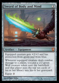| Nome em Inglês: | Sword of Body and Mind | | Nome em Português: | Sem nome em Português | | Custo de Mana: |  | | Tipo: | Artefato - Equipamento | | Texto: | A criatura Equipada ganha +2/+2 e tem Proteção contra o verde e contra o azul. Toda vez que a criatura Equipada causar dano de combate a um jogador, você coloca no Campo de Batalha uma ficha de criatura verde 2/2 do tipo Lobo e aquele jogador coloca os dez cards do topo de seu próprio grimório em seu próprio cemitério. Equipar . | | Série: |  | | Outras: | | | Raridade: | Mítico Raro | | Card: | 014 |