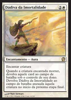 | Nome em Inglês: | Gift of Immortality | | Nome em Português: | Dádiva da Imortalidade | | Custo de Mana: |   | | Tipo: | Encantamento - Aura | | Texto: | Encantar criatura. Quando a criatura encantada Morrer, devolva aquele card ao Campo de Batalha sob controle de seu dono. Devolva Gift of Immortality ao Campo de Batalha anexado àquela criatura no início da próxima Etapa Final. | | Série: |  | | Raridade: | Raro | | Card: | 014 |