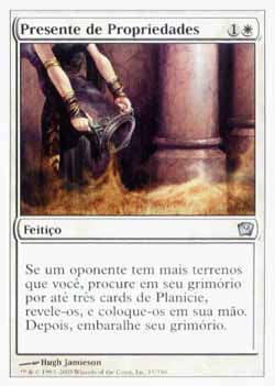 | Nome em Inglês: | Gift of Estates | | Nome em Português: | Presente de Propriedades | | Custo de Mana: |   | | Tipo: | Feitiço | | Texto: | Se seu oponente controla mais terrenos do que você, procure em seu grimório por até três cards de Planície, revele-os e coloque-os em sua mão. Embaralhe seu grimório a seguir. | | Série: |  | | Outras: | | | Raridade: | Incomum | | Card: | 015 |