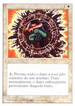 | Nome em Inglês: | Circle of Protection: Artifacts | | Nome em Português: | Círculo de Proteção: Artefatos | | Custo de Mana: |   | | Tipo: | Encantamento | | Texto: | : Na próxima vez que uma fonte a sua escolha que seja um artefato fosse causar dano a você durante este turno, previne aquele dano. | | Série: |  | | Outras: | | | Raridade: | Incomum | | Card: | 016 |