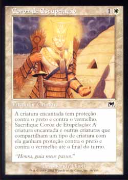 | Nome em Inglês: | Crown of Awe | | Nome em Português: | Coroa de Estupefação | | Custo de Mana: |   | | Tipo: | Encantamento - Aura | | Texto: | Encantar criatura. A criatura encantada tem Proteção contra o preto e Proteção contra o vermelho. Sacrifique Crown of Awe: A criatura encantada e outras criaturas que compartilhem um tipo de criatura com aquela criatura têm Proteção contra o preto e Proteção contra o vermelho até o final do turno. | | Série: |  | | Raridade: | Comum | | Card: | 016 |