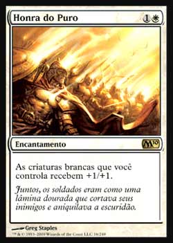 | Nome em Inglês: | Honor of the Pure | | Nome em Português: | Honra do Puro | | Custo de Mana: |   | | Tipo: | Encantamento | | Texto: | As criaturas brancas que você controla ganham +1/+1. | | Série: |  | | Outras: | | | Raridade: | Raro | | Card: | 016 |