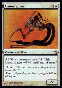 | Nome em Inglês: | Armor Sliver | | Nome em Português: | Sem nome em Português | | Custo de Mana: |   | | Tipo: | Criatura - Fractius | | Texto: | Todas as criaturas do tipo Fractius têm ' : Esta criatura ganha +0/+1 até o final do turno.' | | P/T: | 2/2 | | Série: |  | | Outras: | | | Raridade: | Incomum | | Card: | 016 |