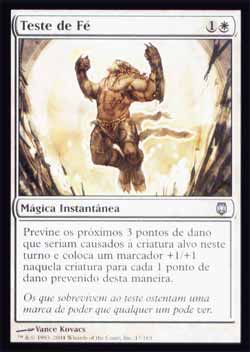 | Nome em Inglês: | Test of Faith | | Nome em Português: | Teste de Fé | | Custo de Mana: |   | | Tipo: | Mágica Instantânea | | Texto: | Previne os próximos 3 pontos de dano que seriam causados à criatura alvo durante este turno, e coloque um marcador +1/+1 naquela criatura para cada 1 ponto de dano prevenido desta forma. | | Série: |  | | Outras: | | | Raridade: | Incomum | | Card: | 017 |