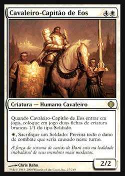 | Nome em Inglês: | Knight-Captain of Eos | | Nome em Português: | Cavaleiro-Capitão de Eos | | Custo de Mana: |   | | Tipo: | Criatura - Humano Cavaleiro | | Texto: | Quando Knight-Captain of Eos entrar no Campo de Batalha, coloque no Campo de Batalha duas fichas de criatura branca 1/1 do tipo Soldado.