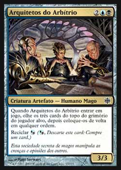 | Nome em Inglês: | Architects of Will | | Nome em Português: | Arquitetos do Arbítrio | | Custo de Mana: |    | | Tipo: | Criatura Artefato - Humano Mago | | Texto: | Quando Architects of Will entrar no Campo de Batalha, olhe os três cards do topo do grimório do jogador alvo e coloque-os de volta no topo do grimório daquele jogador em qualquer ordem. Reciclar . | | P/T: | 3/3 | | Série: |  | | Outras: | | | Raridade: | Comum | | Card: | 017 |