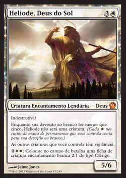 | Nome em Inglês: | Heliod, God of the Sun | | Nome em Português: | Heliode, Deus do Sol | | Custo de Mana: |   | | Tipo: | Criatura Encantamento Lendária - Deus | | Texto: | Indestrutível. Enquanto sua Devoção ao branco for menor que cinco, Heliod não é uma criatura. As outras criaturas que você controla têm Vigilância.