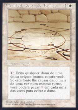 | Nome em Inglês: | Circle of Protection: White | | Nome em Português: | Circulo de Proteção: Branco | | Custo de Mana: |   | | Tipo: | Encantamento | | Texto: | : Na próxima vez que uma fonte branca de sua escolha fosse causar dano a você durante este turno, previne aquele dano. | | Série: |  | | Outras: | | | Raridade: | Comum | | Card: | 018 |