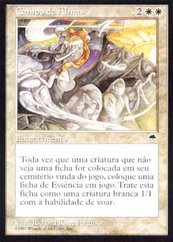 | Nome em Inglês: | Field of Souls | | Nome em Português: | Campo de Almas | | Custo de Mana: |    | | Tipo: | Encantamento | | Texto: | Toda vez que uma criatura que não seja uma ficha for colocada em seu cemitério, coloque no Campo de Batalha uma ficha de criatura branca 1/1 do tipo Espírito com Voar. | | Série: |  | | Outras: | | | Raridade: | Raro | | Card: | 018 |