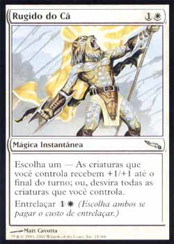 | Nome em Inglês: | Roar of the Kha | | Nome em Português: | Rugido do Cã | | Custo de Mana: |   | | Tipo: | Mágica Instantânea | | Texto: | Escolha uma - as criaturas que você controla ganham +1/+1 até o final do turno; ou desvire todas as criaturas que você controla. Entrelaçar  . | | Série: |  | | Raridade: | Incomum | | Card: | 018 |