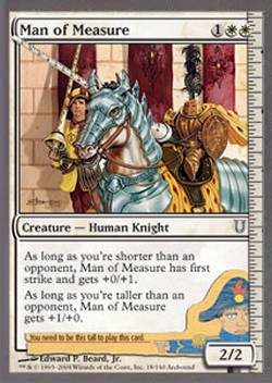 | Nome em Inglês: | Man of Measure | | Nome em Português: | Sem nome em Português | | Custo de Mana: |    | | Tipo: | Criatura - Humano Cavaleiro | | Texto: | Enquanto você for mais baixo que seu oponente, Man of Measure tem Iniciativa e ganha +0/+1. Enquanto você for mais alto que seu oponente, Man of Measure ganha +1/+0. | | P/T: | 2/2 | | Série: |  | | Raridade: | Comum | | Card: | 018 |