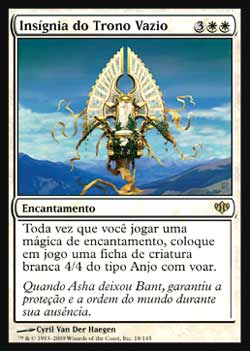 | Nome em Inglês: | Sigil of the Empty Throne | | Nome em Português: | Insígnia do Trono Vazio | | Custo de Mana: |    | | Tipo: | Encantamento | | Texto: | Toda vez que você Conjurar uma mágica de encantamento, coloque no Campo de Batalha uma ficha de criatura branca 4/4 do tipo Anjo com Voar. | | Série: |  | | Outras: | | | Raridade: | Raro | | Card: | 018 |