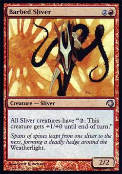 | Nome em Inglês: | Barbed Sliver | | Nome em Português: | Sem nome em Português | | Custo de Mana: |   | | Tipo: | Criatura - Fractius | | Texto: | Todas as criaturas do tipo Fractius têm ' : Esta criatura ganha +1/+0 até o final do turno.' | | P/T: | 2/2 | | Série: |  | | Outras: | | | Raridade: | Incomum | | Card: | 018 |