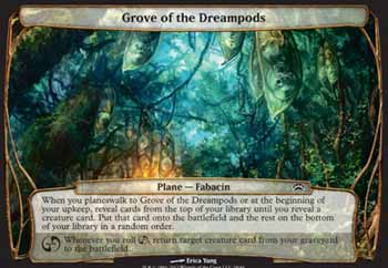 | Nome em Inglês: | Grove of the Dreampods | | Nome em Português: | Sem nome em Português | | Tipo: | Plano - Fabacin | | Texto: | Quando você Saltar para Grove of the Dreampods ou no início de sua Etapa de Manutenção, revele cards do topo de seu grimório até você revelar um card de criatura. Coloque aquele card no Campo de Batalha e o restante no fundo de seu grimório em ordem aleatória. Toda vez que você obtiver no dado, devolva um card de criatura alvo de seu cemitério para o Campo de Batalha. | | Série: |  | | Raridade: | NA | | Card: | 018 |