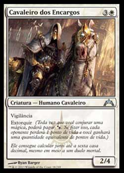 | Nome em Inglês: | Knight of Obligation | | Nome em Português: | Cavaleiro dos Encargos | | Custo de Mana: |   | | Tipo: | Criatura - Humano Cavaleiro | | Texto: | Vigilância. Extorquir. | | P/T: | 2/4 | | Série: |  | | Raridade: | Incomum | | Card: | 018 |