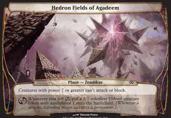 | Nome em Inglês: | Hedron Fields of Agadeem | | Nome em Português: | Sem nome em Português | | Tipo: | Plano - Zendikar | | Texto: | As criaturas com poder 7 ou maior não podem atacar ou bloquear. Toda vez que você obtiver no dado, coloque no Campo de Batalha uma ficha de criatura incolor 7/7 do tipo Eldrazi com Aniquilador 1. | | Série: |  | | Raridade: | NA | | Card: | 019 |