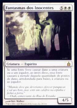 | Nome em Inglês: | Ghosts of the Innocent | | Nome em Português: | Fantasmas dos Inocentes | | Custo de Mana: |    | | Tipo: | Criatura - Espírito | | Texto: | Se uma fonte fosse causar dano a uma criatura ou a um jogador, ao invés disso, aquela fonte causará a metade daquela quantidade de pontos de dano, arredondada para baixo, à criatura ou ao jogador. | | P/T: | 4/5 | | Série: |  | | Raridade: | Raro | | Card: | 020 |