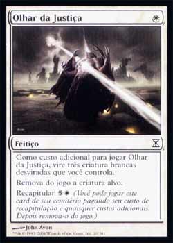 | Nome em Inglês: | Gaze of Justice | | Nome em Português: | Olhar da Justiça | | Custo de Mana: |  | | Tipo: | Feitiço | | Texto: | Como um custo adicional para Conjurar Gaze of Justice, vire três criaturas brancas que você controla. Exile a criatura alvo. Recapitular  . | | Série: |  | | Raridade: | Comum | | Card: | 020 |
