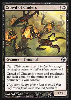 | Nome em Inglês: | Crowd of Cinders | | Nome em Português: | Sem nome em Português | | Custo de Mana: |   | | Tipo: | Criatura - Elemental | | Texto: | Amedrontar. O poder e a resistência de Crowd of Cinders são ambos iguais ao número de Permanentes pretas que você controla. | | P/T: | */* | | Série: |  | | Outras: | | | Raridade: | Incomum | | Card: | 021 |
