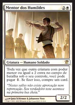 | Nome em Inglês: | Mentor of the Meek | | Nome em Português: | Mentor dos Humildes | | Custo de Mana: |   | | Tipo: | Criatura - Humano Soldado | | Texto: | Toda vez que outra criatura com poder 2 ou menor entrar no Campo de Batalha sob seu controle, você pode pagar . Se o fizer, compre um card. | | P/T: | 2/2 | | Série: |  | | Raridade: | Raro | | Card: | 021 |