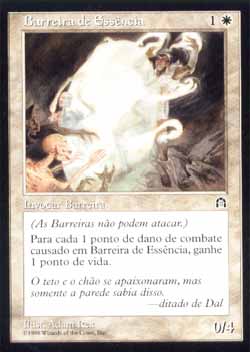 | Nome em Inglês: | Wall of Essence | | Nome em Português: | Barreira de Essência | | Custo de Mana: |   | | Tipo: | Criatura - Barreira | | Texto: | Defensor. Toda vez que Wall of Essence sofrer dano de combate, você ganha a mesma quantidade de pontos de vida. | | P/T: | 0/4 | | Série: |  | | Raridade: | Incomum | | Card: | 022 |