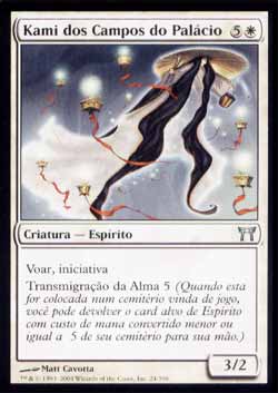 | Nome em Inglês: | Kami of the Palace Fields | | Nome em Português: | Kami dos Campos do Palácio | | Custo de Mana: |   | | Tipo: | Criatura - Espírito | | Texto: | Voar, Iniciativa. Transmigração da Alma 5. | | P/T: | 3/2 | | Série: |  | | Raridade: | Incomum | | Card: | 024 |
